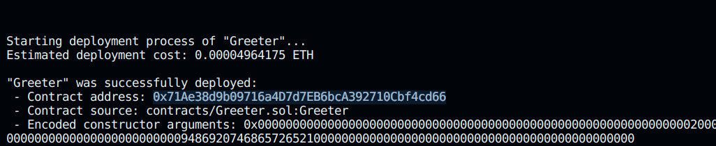**Step 6: Interacting with the contract -** once it is deployed copy the contract address from the logs, you can see in the below screenshot 0x71Ae38d9b09716a4D7d7EB6bcA392710Cbf4cd66