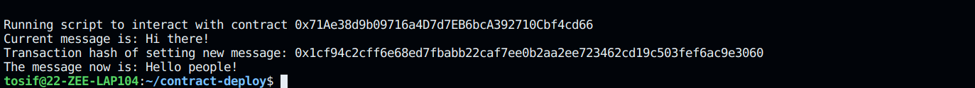 You will see output something like this, you can modify and play around with the /deploy/interact.ts to interact with the contract with different values.