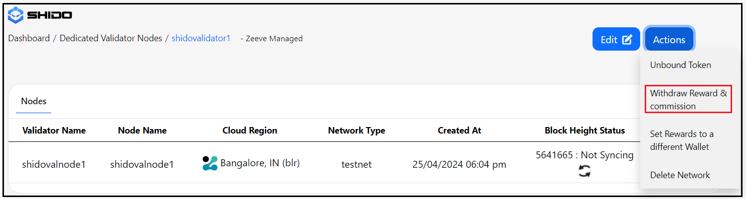 **Step 2: Navigate to Withdraw Rewards -** From the **Actions** menu on the top right, select the **Withdraw Rewards & Commission** option on the Network page.